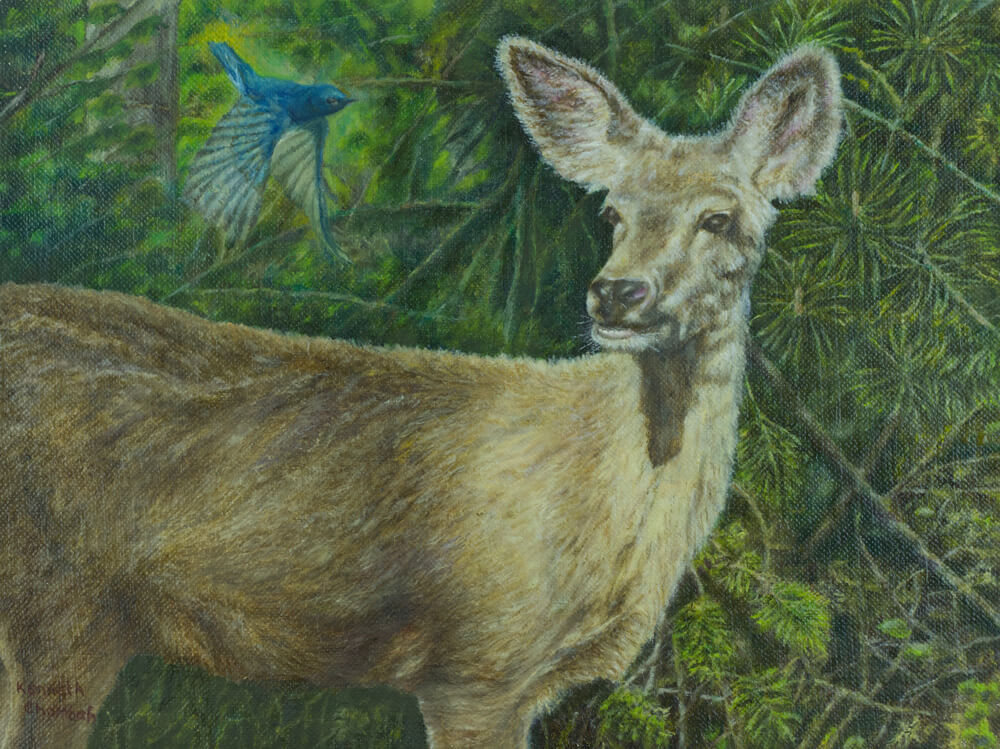 The mule deer had been browsing and for a fleeting moment, the sun cast dramatic lighting on the deer and the surroundings. The scene was transformed into something akin to a dramatic theater stage, lit by a talented lighting designer.
